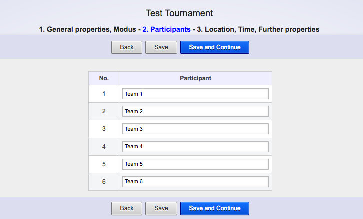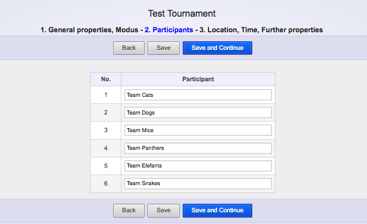 Here, you can enter the names of all the teams that are going to participate in your tournament. If you don't know all of the participants yet, just click Save to save your work until here – you can always come back here and continue editing. You can also go to the next step and come back later by clicking Back. Now, it looks like this for me: