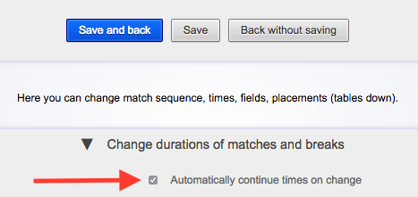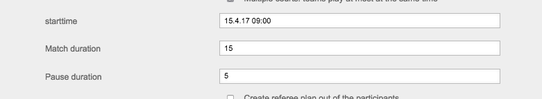 Then, you'll find the time settings. Here, you can enter the starting time, duration of each match, and duration of breaks between matches. I want my tournament to start at 8am. Also, I want one match to last for 15 minutes and there should be a 5 minute break between matches. Continue reading under Set date and time for matches. It'll look like this in the end: