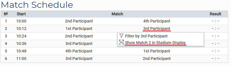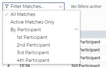 You can choose what you want to be displayed under Group, Matchdays and Match number. Here, you can pick a group or matchday (groups can only be picked when there is a group phase in the tournament, matchdays can only be picked within leagues). You can also filter for participants but beware that when you select one participant the selection of a group will be ignored. Filtering for matchdays will ignore the filter for participants.