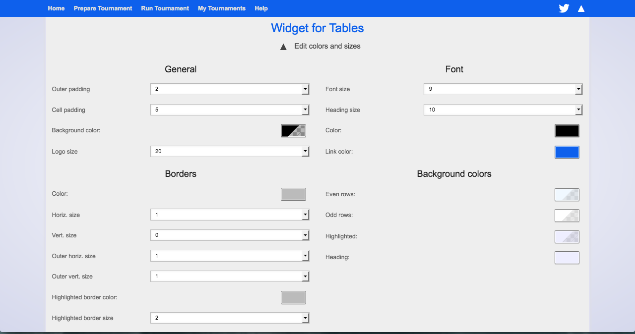 Widgets can be edited individually: you can adjust colors and sizes in the way you like. On the widget page pick the widget you want to work on and click on the little triangle next to Edit colors and sizes. The settings for colors and sizes will open now.